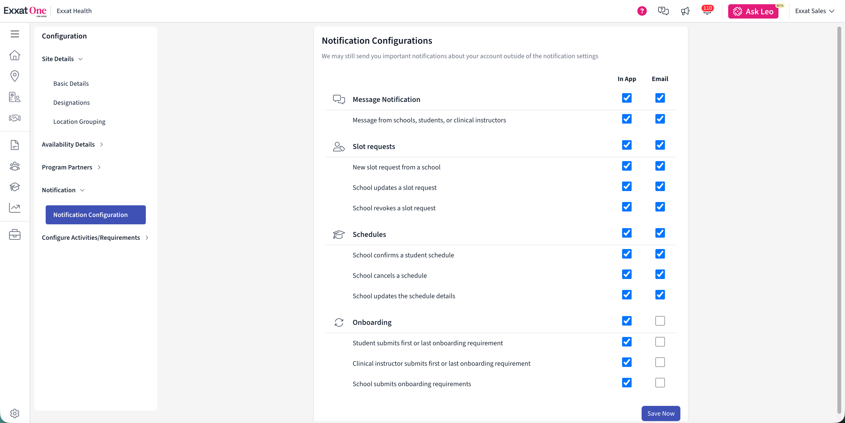 - In-App – Displays notifications inside Exxat One