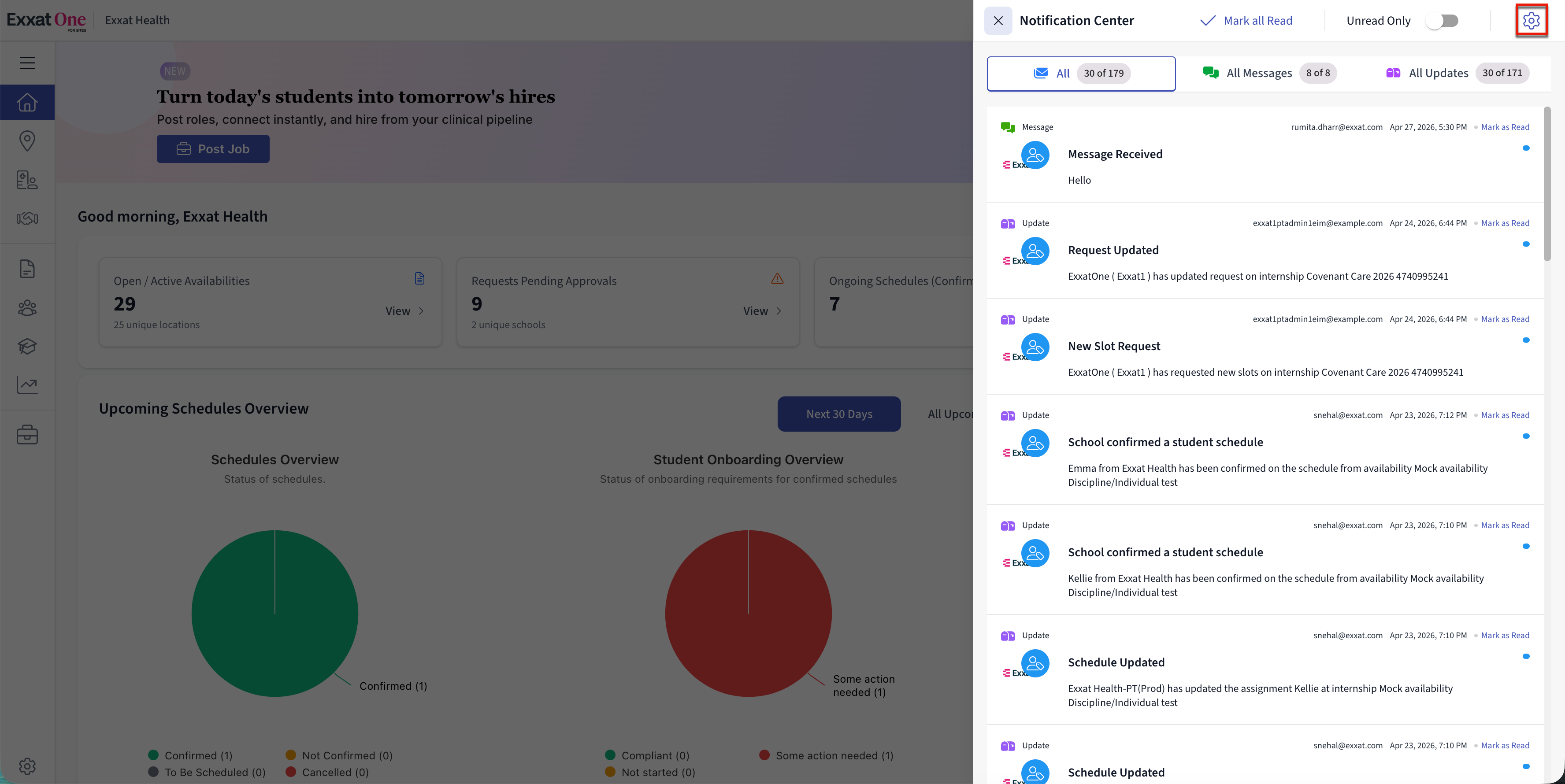 Notifications in Exxat One for Sites help you stay informed about important updates from your partner schools. Instead of manually checking for changes, the system alerts you whenever actions such as slot requests, messages, schedule updates, or onboarding submissions occur.