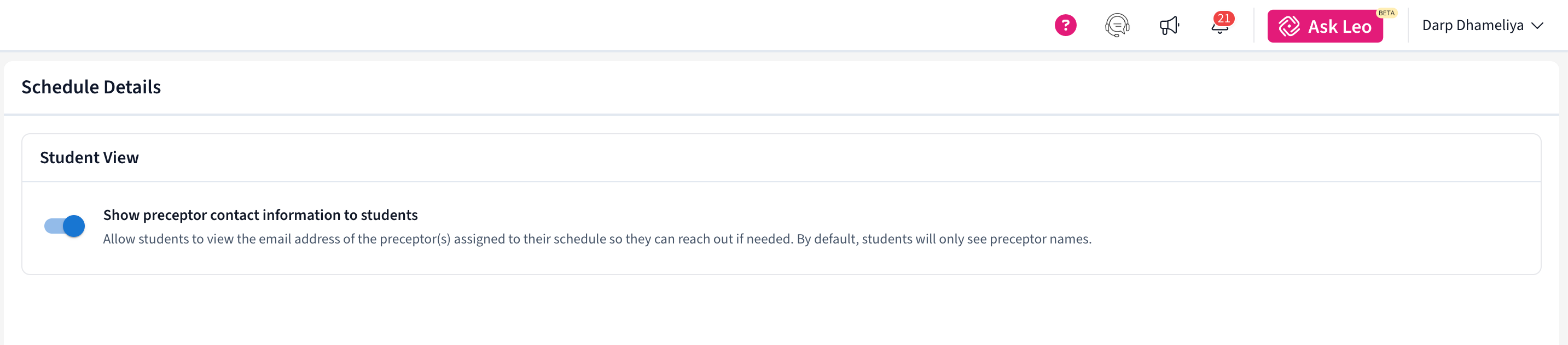 - When Enabled: Students can view both the preceptor’s name and email address in their schedule.