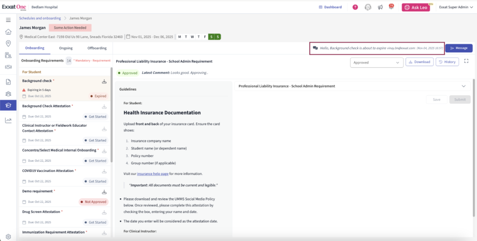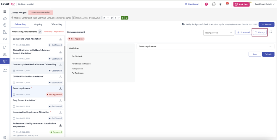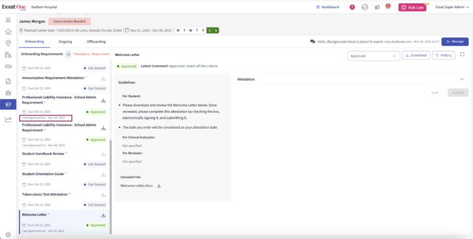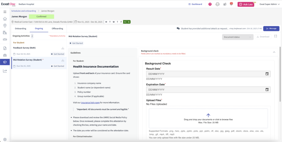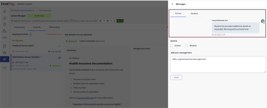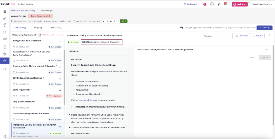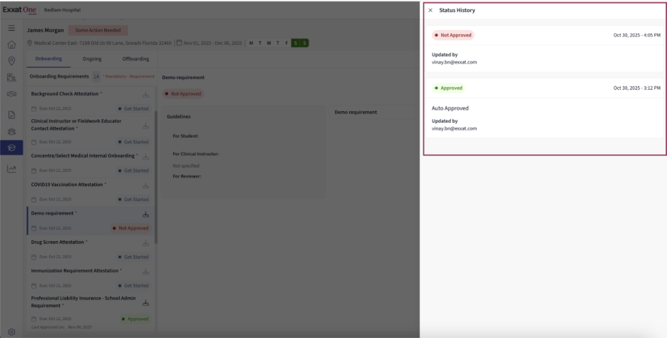 When students complete multiple placements at the same site, previously fulfilled requirements may carry forward based on the site’s configured rules.