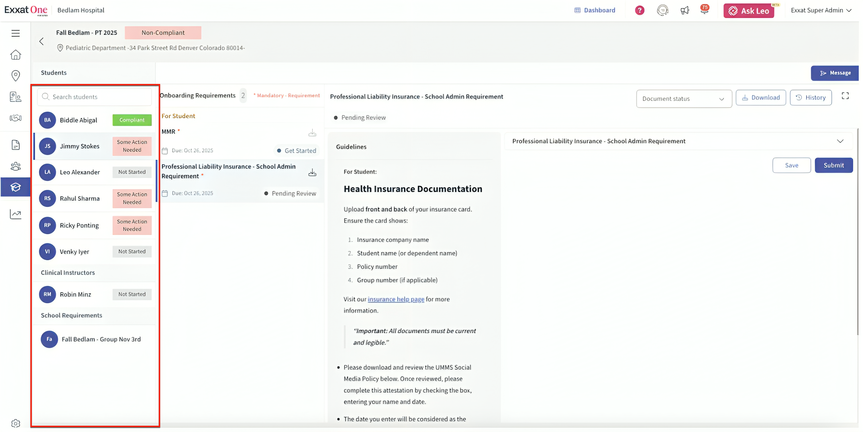 - Once the view is expanded you can see the names of students and CI/Instructors and students, their compliance status, and school.
