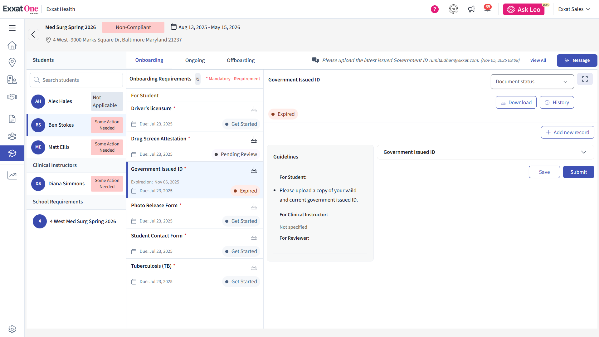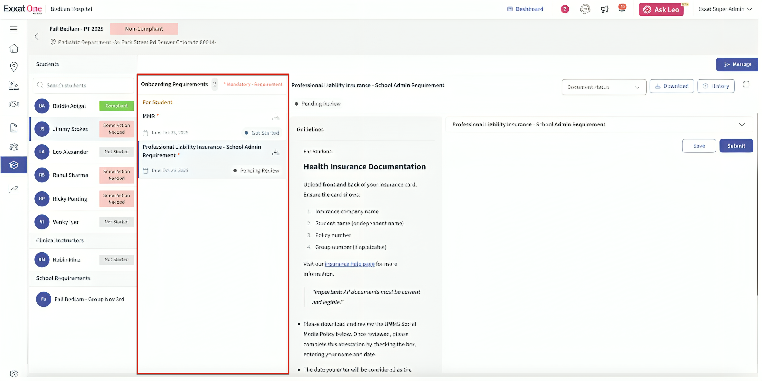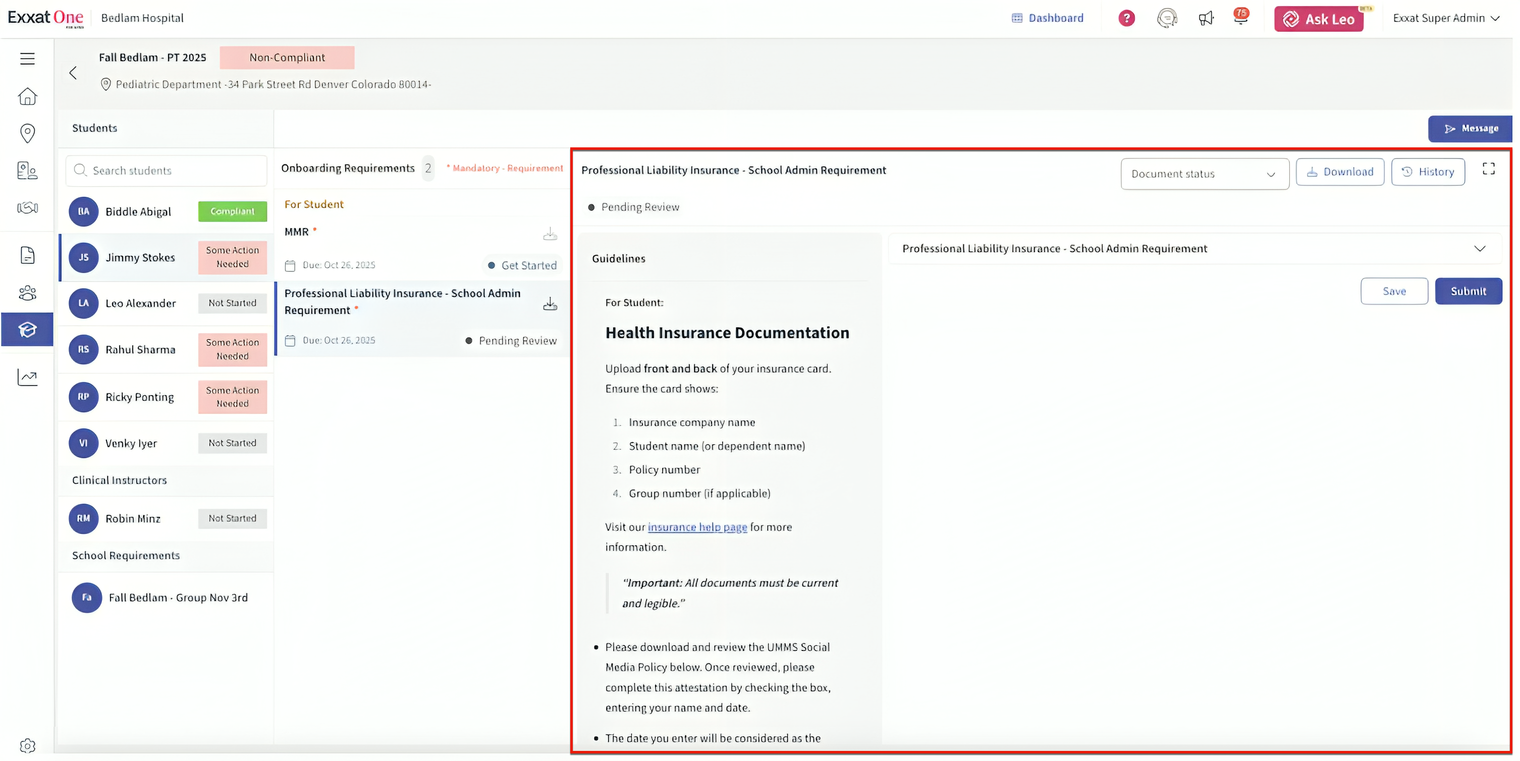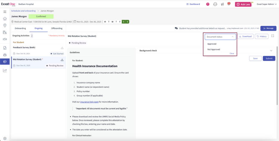 - To Review a Student’s Onboarding documents click the Compliant or Not Compliant button in the details screen.
