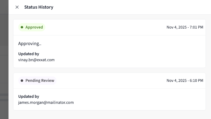 - Review prior entries, including completion/dose details, expiration information, and previously uploaded documents.