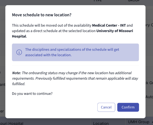 A popup will appear prompting you to confirm the action and provide a reason for cancellation and click Confirm to cancel the group schedule.