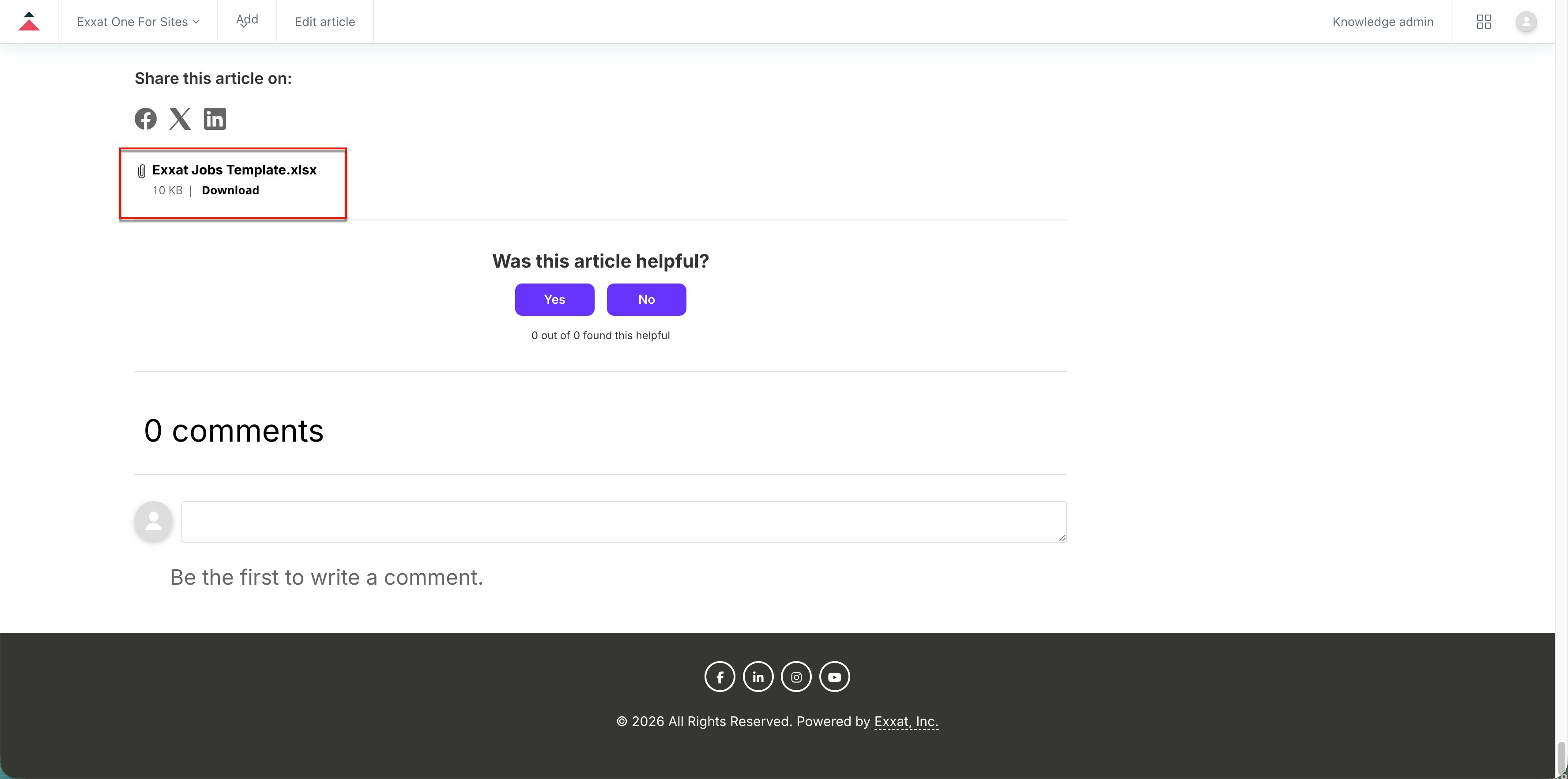 The Exxat Jobs Template (.xlsx file) is attached at the bottom of this article. Scroll to the end of the page to locate the attachment and click Download to access the file.
