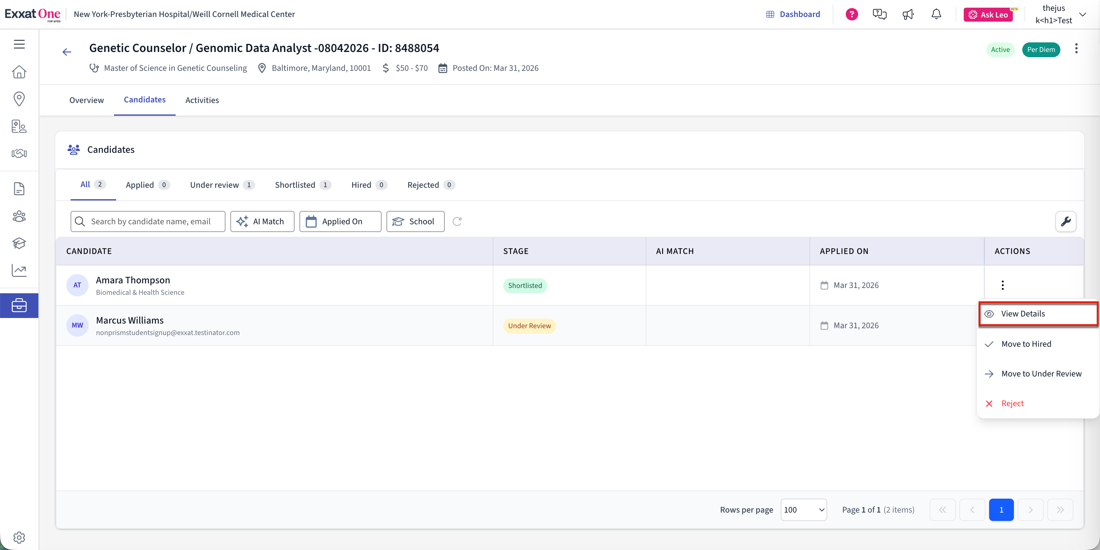 Click on a candidate name or select View Details to open the full application.