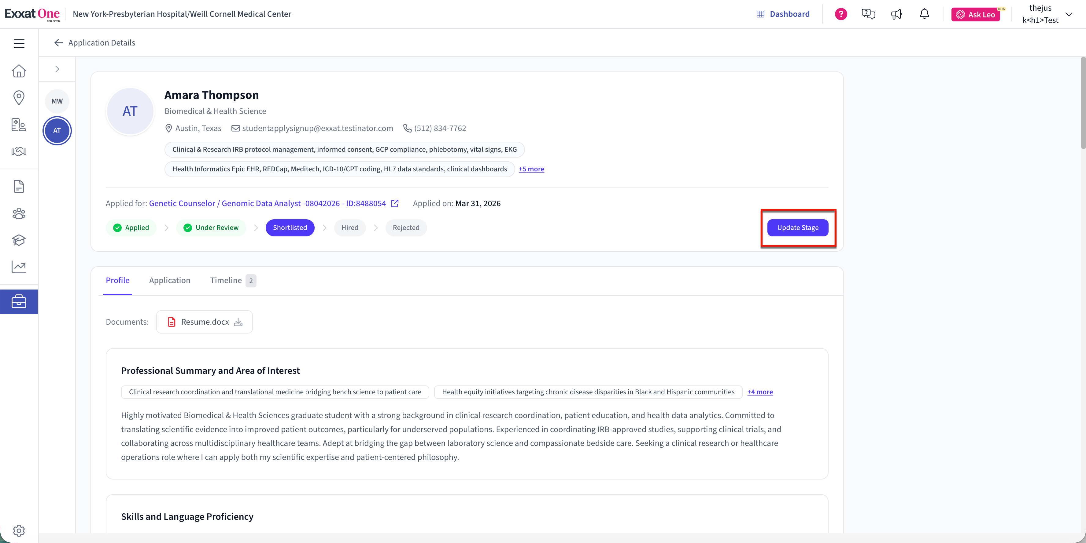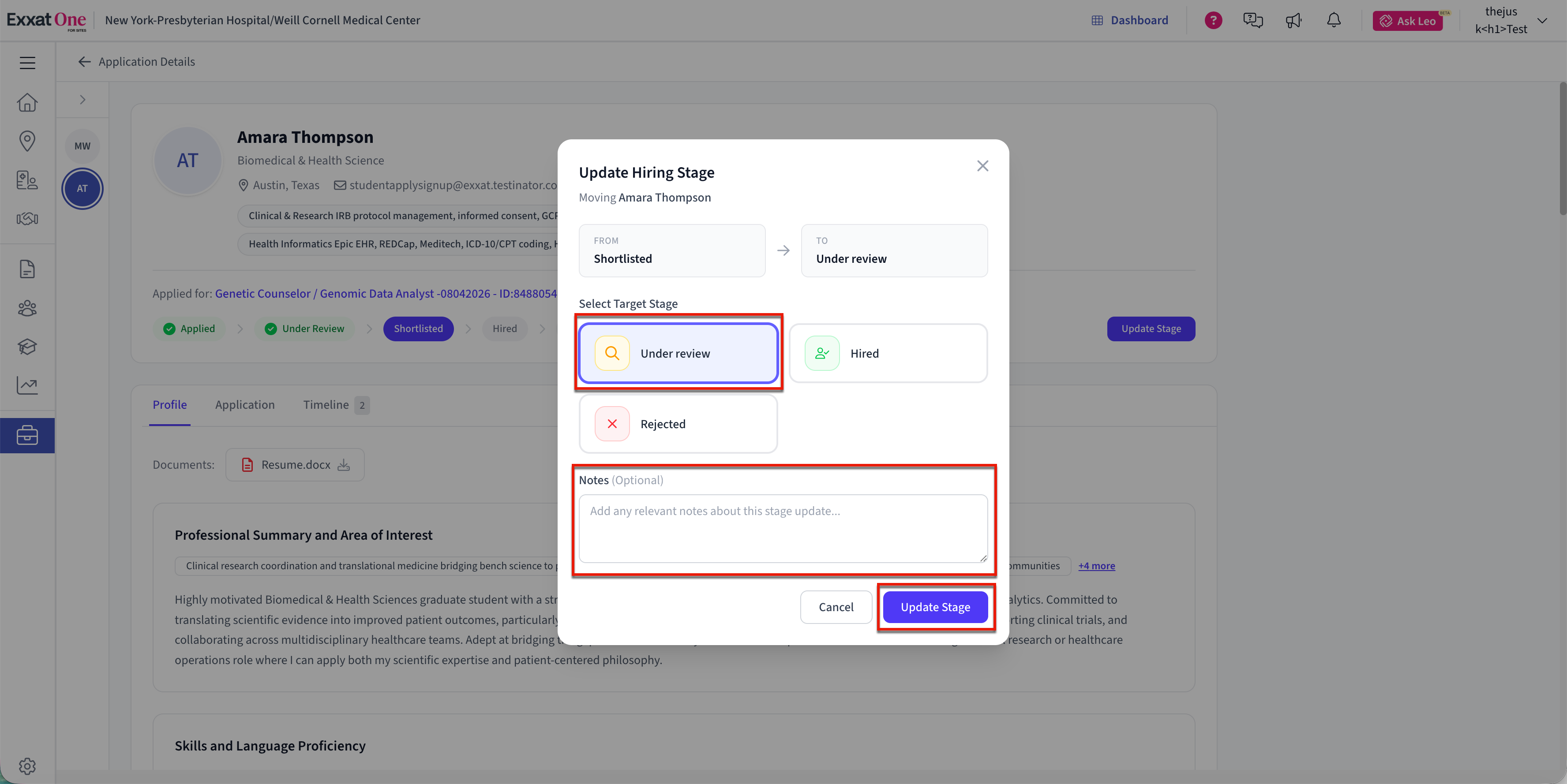 - Move to Next Stage (Move to Shortlisted) – Advances the candidate to the shortlisted stage